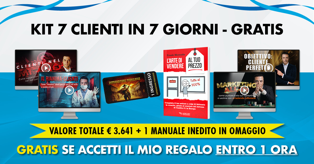 GRATIS per te il kit 7 Clienti in 7 Giorni: oltre 300 minuti di formazione marketing + un manuale inedito, mai visto prima, per imparare a riempire la tua azienda di clienti che comprano e ad allontanare per sempre gli scrocconi.